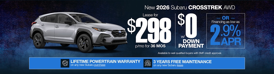 Offers available to well qualified buyers with SMF credit approval. 2.9% APR Financing available for 36 months. Monthly payment of $29.04 per $1,000 borrowed. Based on closed end lease. $298 Due at signing w/$0 down plus first month's payment, $0 Sec. Dep. and $595 acquisition fee (included in payment). Total Payments: $10,728. Total Cost: $10,728. 7500 miles a year/15¢ per mi. thereafter. Lessee responsible for excess wear & tear. All Prices exclude tax, license & registration fees. Expires 2/2/26.