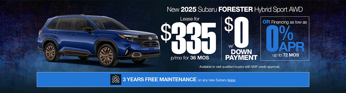 Offers available to well qualified buyers with SMF credit approval. 0% APR Financing available for 72 mos. Monthly payment of $13.89 per $1,000 borrowed. Based on closed end lease. $335 Due at signing w/$0 down plus first month's payment, $0 Sec. Dep. and $595 acquisition fee (included in payment). Total Payments: $12,060. Total Cost: $12,655. 7500 miles a year/15¢ per mi. thereafter. Lessee responsible for excess wear & tear. All Prices exclude tax, license & registration fees. Expires 2/2/26.