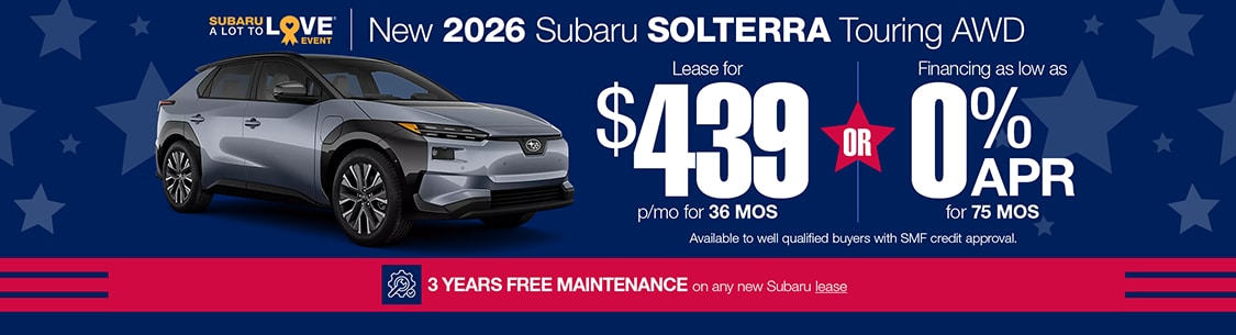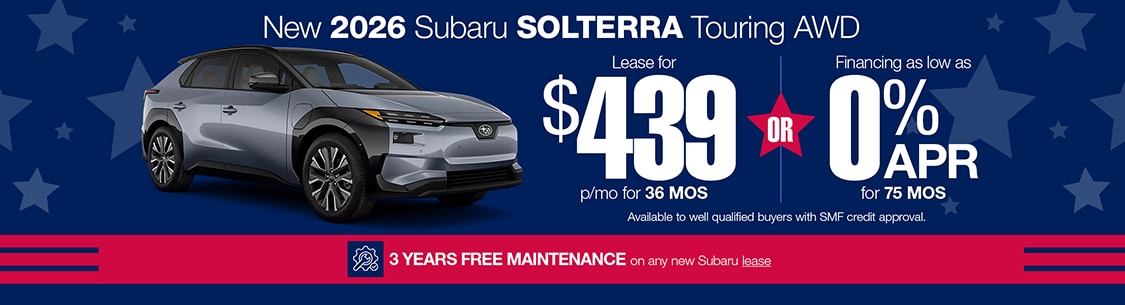 Offers avail to well qualified buyers with SMF credit approval. 0% APR Financing available for up to 75 months. Monthly payment of $13.33 per $1,000 borrowed. Based on closed end lease. $2939 Due at signing w/$2500 down plus first month's payment, $0 Sec. Dep. and $595 acquisition fee (included in payment). Total Payments: $15,804. Total Cost: $18,304. 7500 miles a year/15¢ per mi. thereafter. Lessee resp for excess wear & tear. All Prices exclude tax, license & registration fees. Expires 3/2/26.